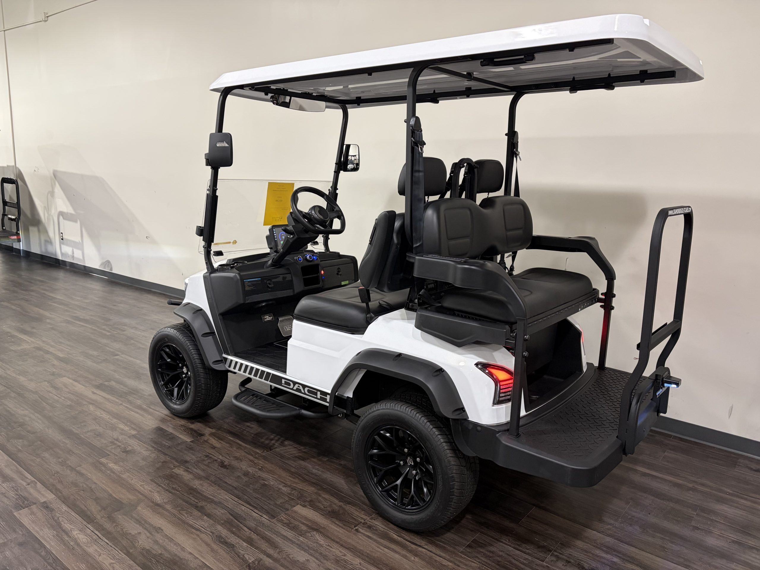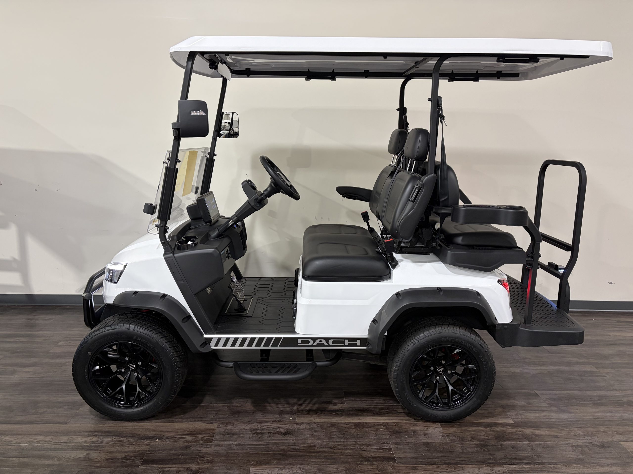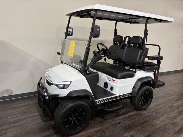 This is one of the hottest street-legal golf cars on the market. Dach has automotive-quality features and strength from the frame and up. This car has a has the classic look of a White body with Black seats – really cool!